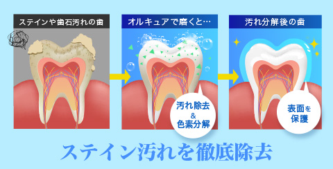 オルキュアはこのステイン汚れの着色を除去するので、白く美しい歯を保つことが出来ます。